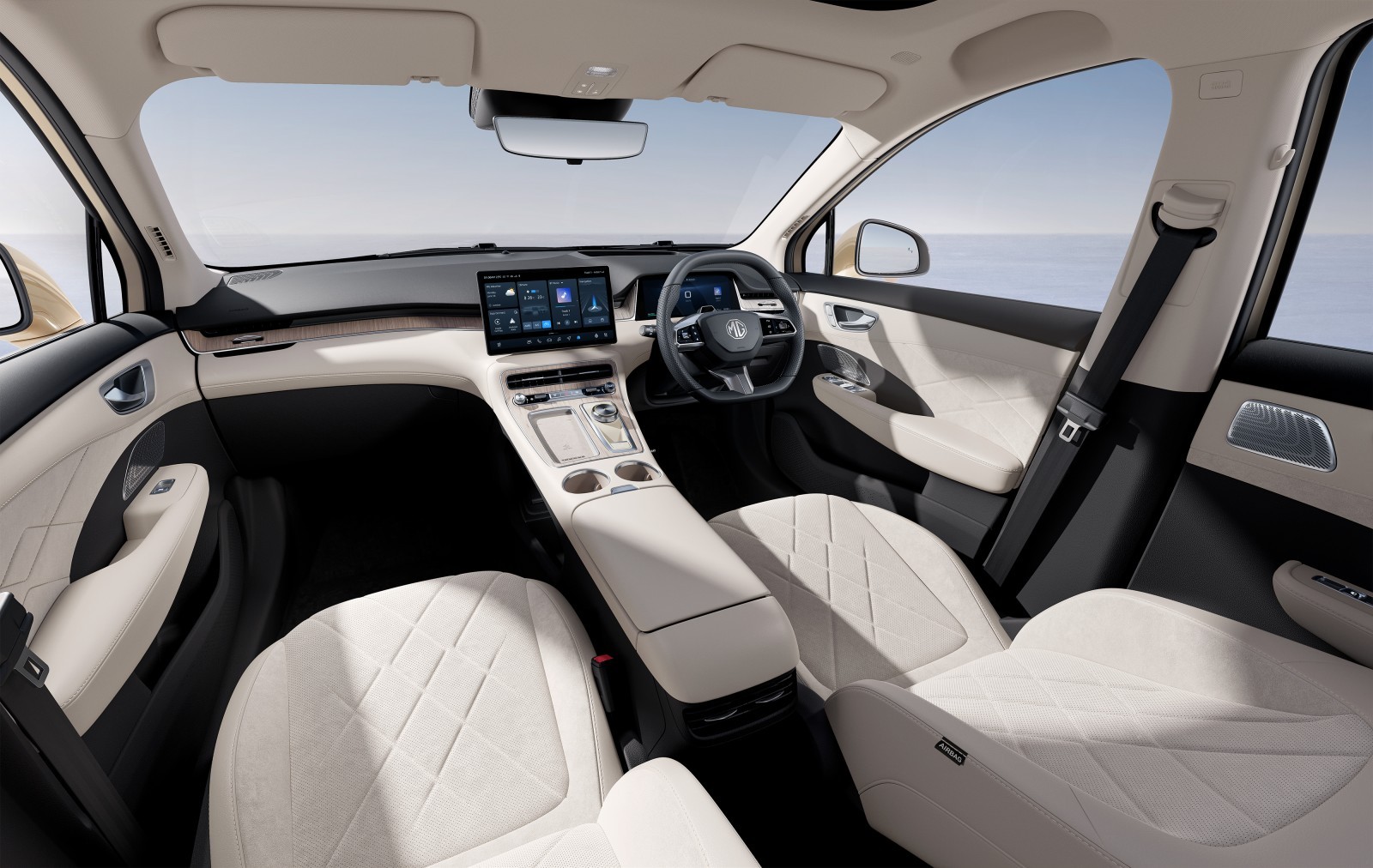 Premium Alcantara and Vegan Leather upholstery complement a bright, airy cabin enhanced by the panoramic glass roof and electric sunshade.